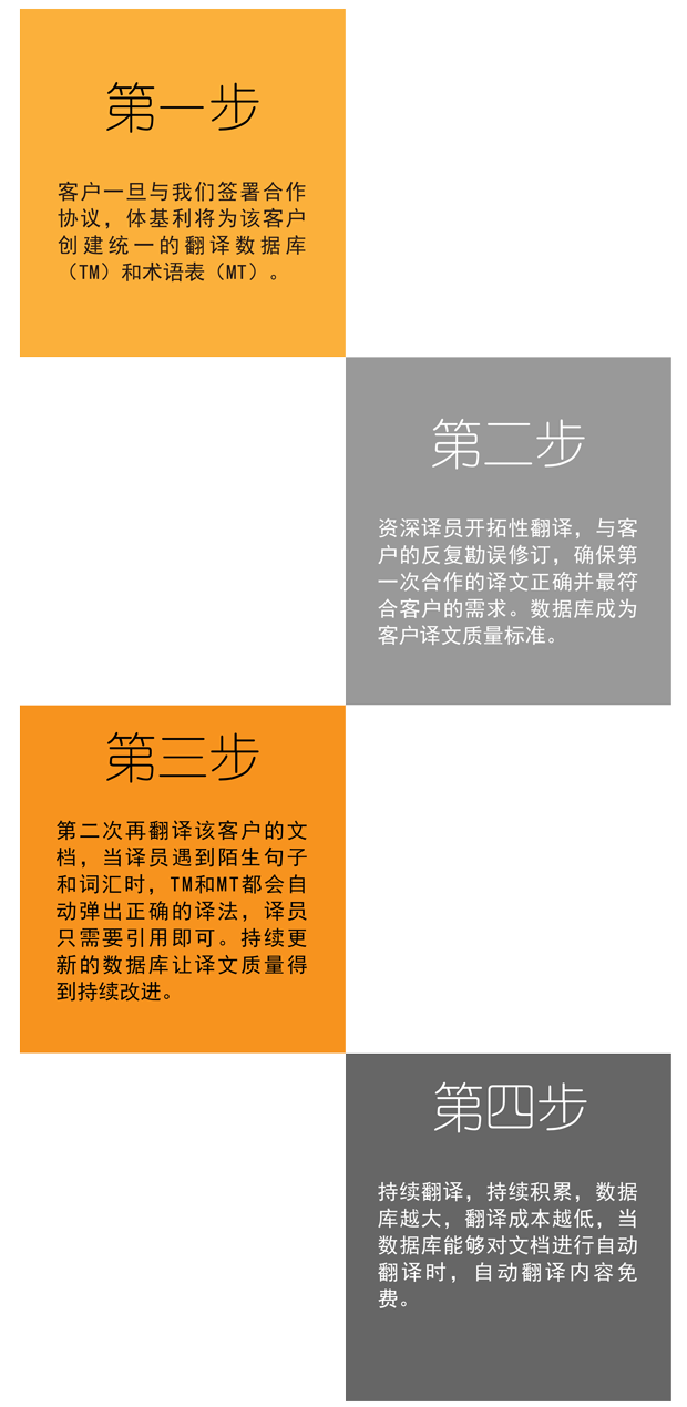 客戶一旦與我們簽署合作協議,體基利將為該客戶創建統一的翻譯數據庫(TM)和術語表(MT)。